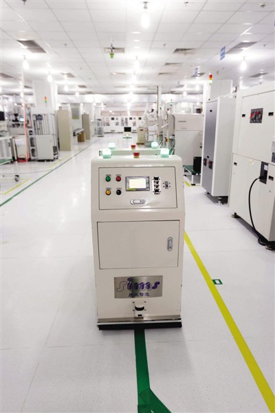 機(jī)器人小車能自動(dòng)加料、送料,沿著地板上的軌跡線移動(dòng),遇到障礙物還會(huì)避開。