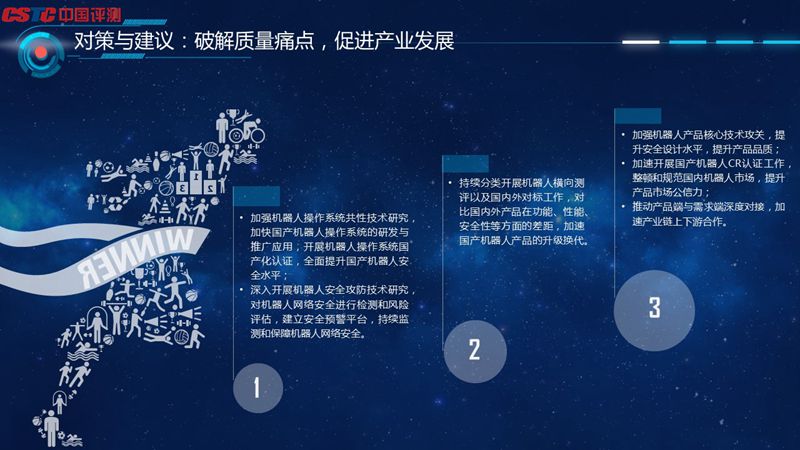 針對(duì)以上機(jī)器人產(chǎn)品質(zhì)量6大痛點(diǎn),中國(guó)軟件評(píng)測(cè)中心機(jī)器人測(cè)試實(shí)驗(yàn)室主任鞏瀟表示,應(yīng)加強(qiáng)機(jī)器人操作系統(tǒng)、安全攻防等共性技術(shù)研究,持續(xù)分類(lèi)開(kāi)展機(jī)器人橫向測(cè)評(píng)以及國(guó)內(nèi)外對(duì)標(biāo)工作,對(duì)比國(guó)內(nèi)外產(chǎn)品在功能、性能、安全性等方面的差距,加速?lài)?guó)產(chǎn)機(jī)器人產(chǎn)品的升級(jí)換代,加速開(kāi)展國(guó)產(chǎn)機(jī)器人CR認(rèn)證工作,規(guī)范國(guó)內(nèi)機(jī)器人市場(chǎng),提升產(chǎn)品市場(chǎng)公信力。