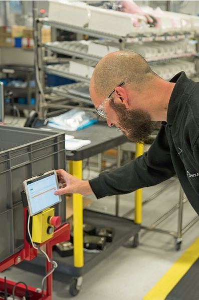 3臺(tái)移動(dòng)機(jī)器人對(duì)精益生產(chǎn)做出了決定性的貢獻(xiàn)。它們從低價(jià)值的物資運(yùn)輸中解放了多才多藝的合格員工,使他們有時(shí)間完成能夠創(chuàng)造更高價(jià)值的生產(chǎn)任務(wù)。這確保了根據(jù)精益原則高效地利用人力資源。另外,移動(dòng)機(jī)器人也解決了服務(wù)部門的一個(gè)瓶頸問(wèn)題:服務(wù)部只有幾名員工,但必須很快地完成每一天的出貨工作任務(wù)。