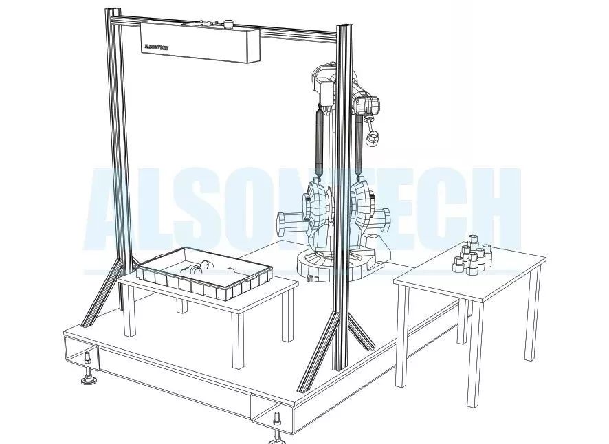 方案采用埃爾森智能科技ALSONECH的AT-S1000傳感器,采用雙目立體成像+激光自動掃描技術(shù),獲取物件的空間坐標數(shù)據(jù),通過數(shù)據(jù)分析識別出工件的空間姿態(tài);使用TCP/IP通信,實現(xiàn)電腦與機器人之間的數(shù)據(jù)交互;可與工廠信息化系統(tǒng)實現(xiàn)網(wǎng)絡(luò)通信,通過以太網(wǎng)口輸出工作站狀態(tài)信息,連接到客戶信息化系統(tǒng)中實現(xiàn)管理。