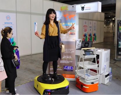 上交會觀眾正站在木蟻機器人上體驗移動搬運樂趣