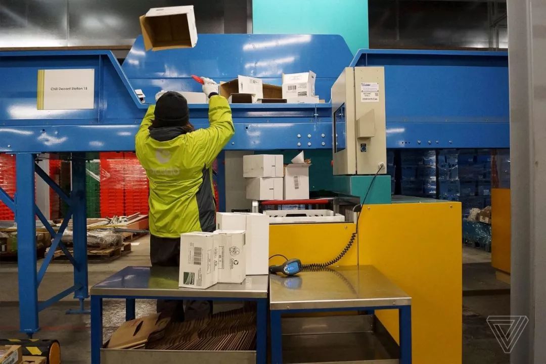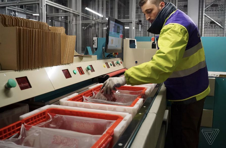 在這些分揀中心里,人類員工從箱子里拿出他們所需要的東西(他們面前的一個屏幕告訴他們需要拿什么)并且將它們放在另一個板條箱中的購物袋中。這兩個板條箱之后都會被送回到網(wǎng)格中去,它們將會重新裝滿貨物或者被送到發(fā)貨區(qū)。