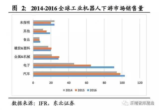 汽車(chē)產(chǎn)業(yè)在工業(yè)機(jī)器人上的投資在2010-2014年間快速增長(zhǎng),而2015-2016年投資增速則有所放緩,據(jù)IFR估計(jì),從目前看來(lái)投資量已經(jīng)接近飽和。
