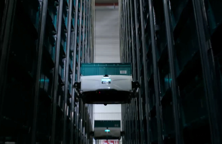 正在攀爬貨架的Skypod
