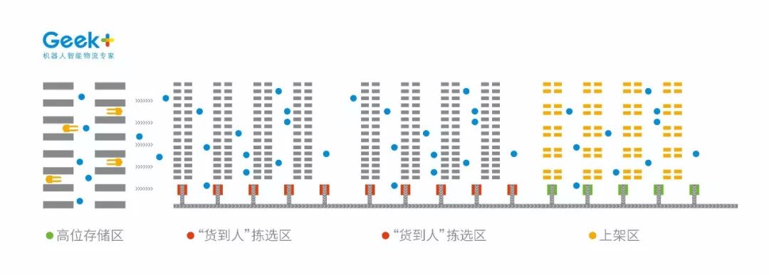 位于昆山的Geek+&云集機(jī)器人倉庫是一個大規(guī)模、全流程半無人倉。整個倉庫共有四個分區(qū):高位存儲區(qū)、上架揀選區(qū)以及兩個“貨到人”揀選區(qū)。倉庫功能包含入庫、上架、揀選、出庫、存儲,可以為電商類客戶提供全流程倉儲物流服務(wù)。