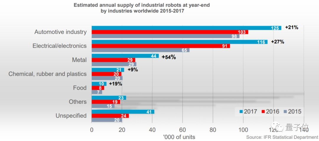 排在第二位的是電氣/電子,2017年的機器人安裝量估計在116,000萬臺,與第一名相差并不太多。而27%的年增長,超過了汽車行業(yè)。