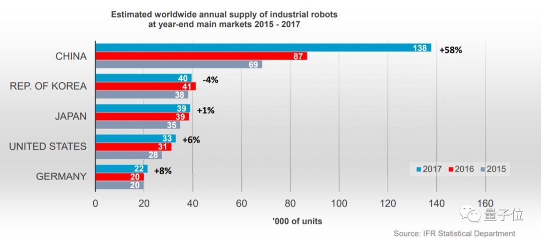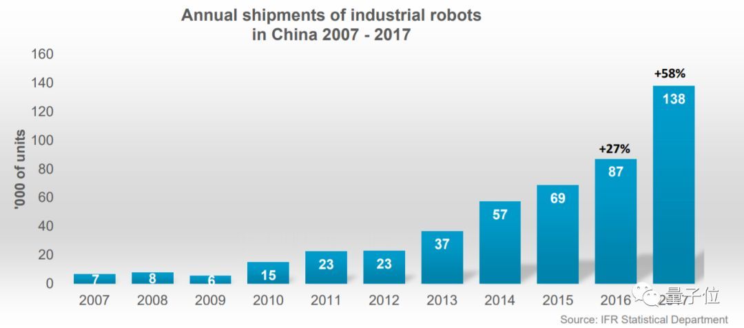 2017年,中國的工業(yè)機器人估計安裝量 (138,000臺) ,比起2016年 (87,000臺) 增長了58%,漲幅也是高居榜首。