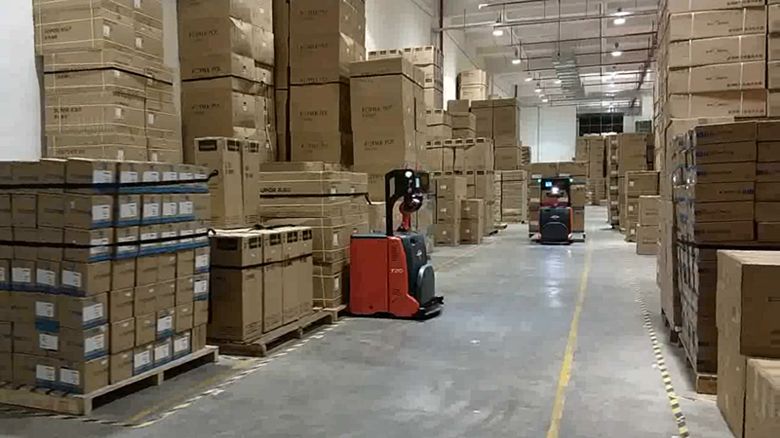 視覺導(dǎo)航托盤式叉車AGV在某大型電商物流現(xiàn)場運行