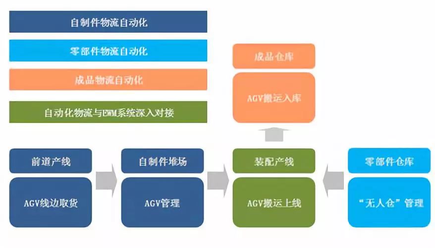 ◆ 全物流自動化搬運(yùn)實(shí)現(xiàn):自制件進(jìn)出堆場、零部件進(jìn)出庫及配送至產(chǎn)線、成品下線入庫均通過機(jī)器人運(yùn)輸替代人工搬運(yùn)