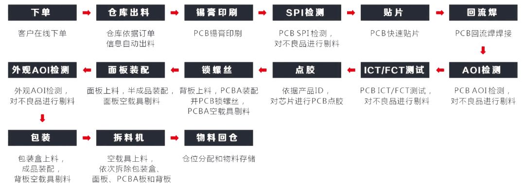 示范平臺(tái)產(chǎn)線主體的主要功能為仿真消費(fèi)類(lèi)電子的生產(chǎn)流程,包括SMT、測(cè)試、裝配等典型生產(chǎn)流程,產(chǎn)線由測(cè)試方案、生產(chǎn)設(shè)備與裝配設(shè)備搭建而成,具體生產(chǎn)工序參見(jiàn)下圖。