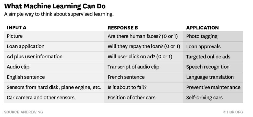 Ng強調(diào),雖然人工智能已經(jīng)有很多成功的實施案例,但大多數(shù)都是在監(jiān)督學(xué)習(xí)的場景下展開應(yīng)用。在這一模式下,每一個訓(xùn)練輸入數(shù)據(jù)庫與正確的輸出決策相關(guān)聯(lián)。機器學(xué)習(xí)算法通過比對這個訓(xùn)練庫的信息來根據(jù)新的輸入數(shù)據(jù)做出決策。監(jiān)督學(xué)習(xí)的一些常見應(yīng)用包括照片標(biāo)記、貸款處理與語音識別。在每一個應(yīng)用案例中,系統(tǒng)都會接收輸入信息 — 比如照片標(biāo)簽應(yīng)用中的圖片 — 并基于它從訓(xùn)練數(shù)據(jù)庫中學(xué)到的信息做出決定或做出反應(yīng)。