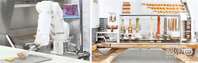 在別處,自動(dòng)漢堡包餐廳Creator(右上)使用20臺(tái)電腦、350個(gè)傳感器和50個(gè)執(zhí)行機(jī)構(gòu),在5分鐘內(nèi)遞送一個(gè)6美元的漢堡。雖然沒(méi)有使用典型的協(xié)作機(jī)械臂或運(yùn)輸機(jī)器人(AGV),該系統(tǒng)本質(zhì)是協(xié)作機(jī)器,它制造的漢堡包通過(guò)人類(lèi)職員交付給客戶(hù)。