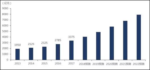 2017年中國(guó)智能物流行業(yè)市場(chǎng)規(guī)模達(dá)3,375億元人民幣,同比增長(zhǎng)21.18%。沙利文數(shù)據(jù)顯示,由于電商發(fā)展的推動(dòng),資本的介入,大數(shù)據(jù)技術(shù)的支持以及智能物流行業(yè)需求不斷被激發(fā),市場(chǎng)規(guī)模將保持增長(zhǎng)態(tài)勢(shì),預(yù)計(jì)到2022年中國(guó)智能物流行業(yè)市場(chǎng)規(guī)模將增長(zhǎng)至7,938億元人民幣,2017到2022年的年復(fù)合增長(zhǎng)率達(dá)18.65%。