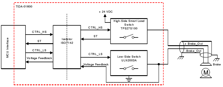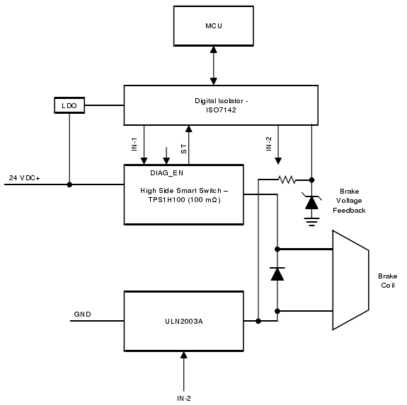 來自制動線圈的電壓反饋可用于監(jiān)控意外接通,還可用于調(diào)整來自制動線圈的電壓。您可以在ULN2003A低側(cè)開關(guān)上選配PWM特性,以便控制制動線圈的峰值和保持電流。