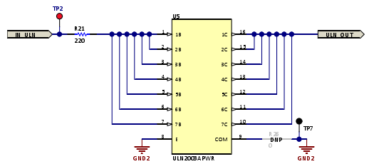 本參考設(shè)計使用ULN2003A作為低側(cè)開關(guān),這是一個高電流達(dá)林頓晶體管陣列。下圖顯示了低側(cè)開關(guān)的電路。