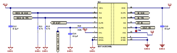 VCC2引腳上施加的是使用TPS7B6933 LDO生成的3.3V電壓。C13(0.1μF)用作VCC2引腳的局部去耦電容器。隔離器的EN2引腳連接至高電平,以啟用次級側(cè)中的輸出通道。