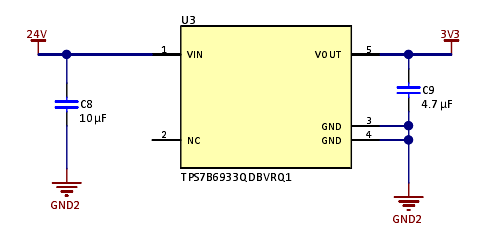 次級側(cè)上的數(shù)字隔離器需要一個3.3V的電源來為其供電。因此,本設(shè)計中使用TPS7B6933將24V轉(zhuǎn)換為3.3V,從而為隔離器的次級側(cè)和高側(cè)開關(guān)供申。下顯示了TPS7B6933的申路。