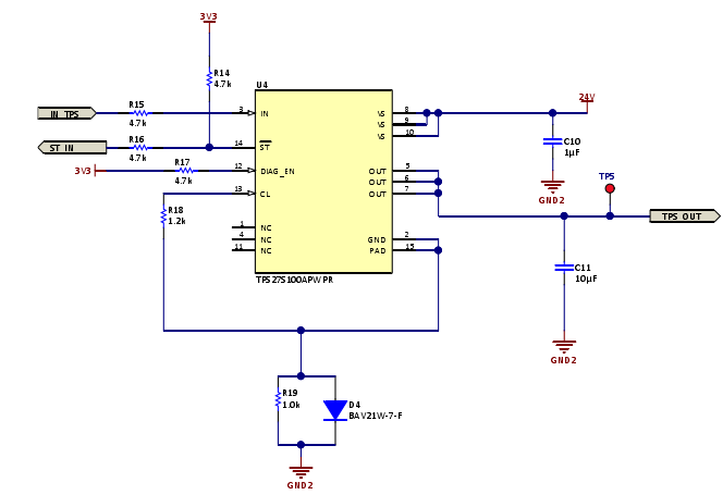 使用TPS27S100作為高側(cè)開關(guān)。下圖顯示了高側(cè)開關(guān)的電路。