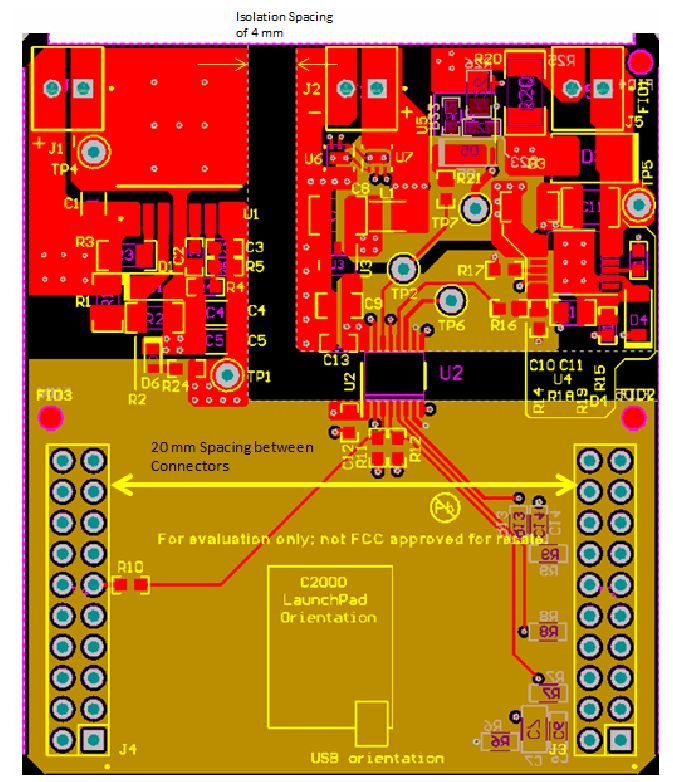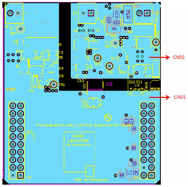 下圖分別顯示了隔離層和接地劃分。初級側(cè)和次級側(cè)銅軌通過隔離層彼此隔離。初級側(cè)和次級側(cè)之間保持著4mm的銅軌間爬電距離。兩個20引腳連接器J3和J4相距20mm,可連接至C2000LaunchPad。電源平而被劃分為3.3V和24V平面。