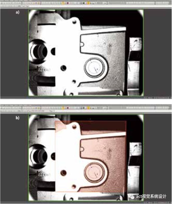 圖4:對于任何孔隙缺陷,可能只需要分析圖像的一部分。為此,首先將機器人移動到特定的已知位置,并捕獲發(fā)動機缸體的一個區(qū)域的圖像(a)。然后使用預編程的方式隔離需要檢查的區(qū)域(以紅色顯示)(b)。