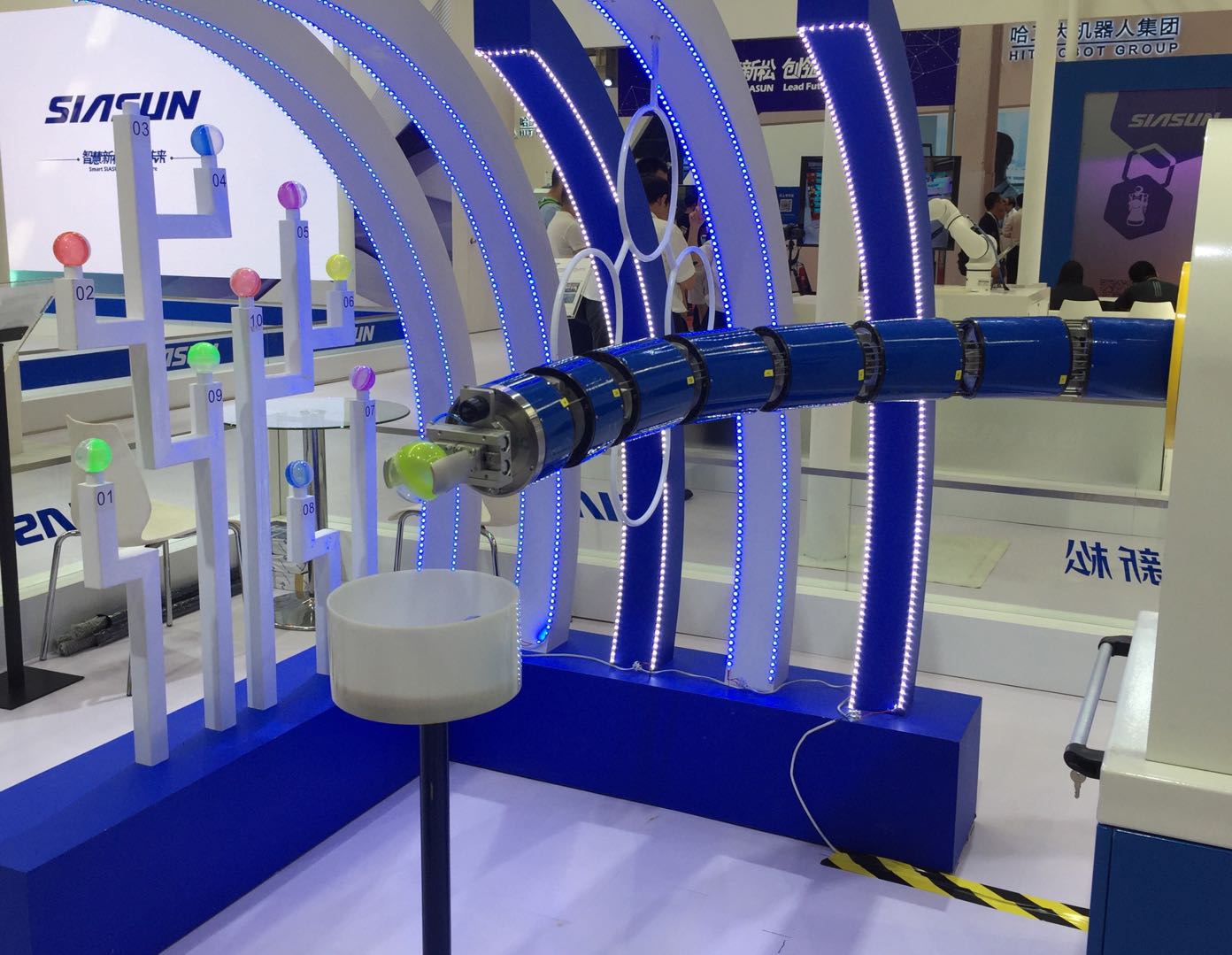 由新松自主研發(fā)的蛇臂機(jī)器人,有12個(gè)關(guān)節(jié)鏈接24+1個(gè)自由度,使它可以在核電、航空航空、搶險(xiǎn)救災(zāi)等特殊環(huán)境中替代人工進(jìn)行作業(yè)。(郝曉明攝)