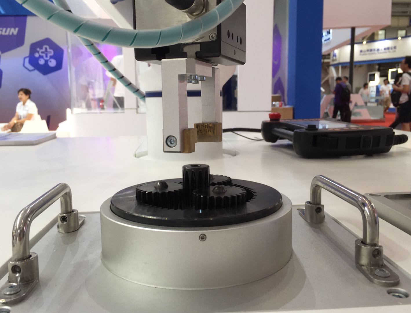 由新松自主研發(fā)的SCR5協(xié)作機(jī)器人在演示齒輪裝配應(yīng)用場景。(郝曉明攝)