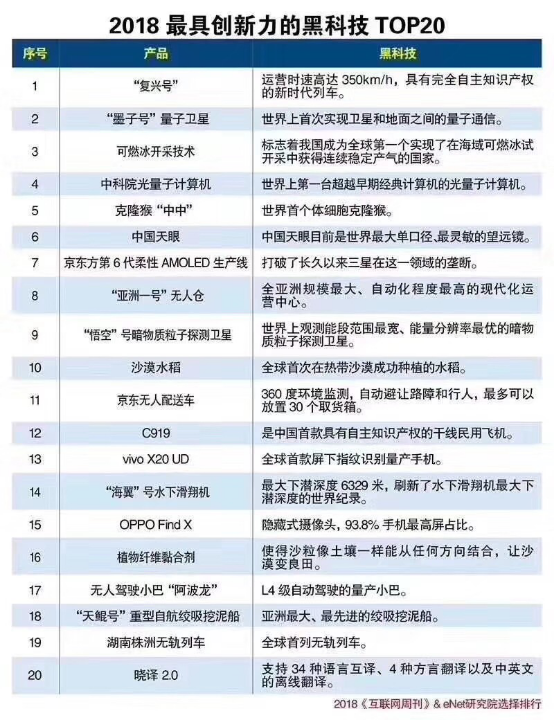 該榜單由中科院主管的《互聯(lián)網(wǎng)周刊》和eNet研究院聯(lián)合發(fā)布。在榜單中,京東物流無人倉(cāng)、配送機(jī)器人與復(fù)興號(hào)、“墨子號(hào)”量子衛(wèi)星、中國(guó)天眼、中科院光量子計(jì)算機(jī)這些展現(xiàn)中國(guó)科技實(shí)力和專業(yè)水準(zhǔn)的黑科技共同入選,成為中國(guó)科技領(lǐng)域最耀眼的國(guó)家名片。