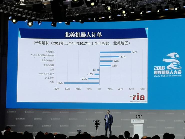 這些是北美2018年上半年的數(shù)據(jù),2018年訂購(gòu)量同比下降了21%,確實(shí)是挺令人驚訝的。具體看,可以發(fā)現(xiàn)一些有希望的行業(yè),也是按照不同應(yīng)用領(lǐng)域進(jìn)行細(xì)分。真正的下滑來(lái)自于汽車(chē)這個(gè)行業(yè),今年購(gòu)買(mǎi)機(jī)器人的數(shù)量是下降的。