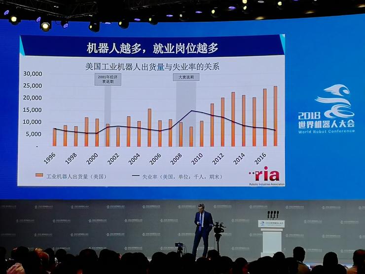 這是美國(guó)二十年來(lái)發(fā)展的情況,會(huì)發(fā)現(xiàn)機(jī)器人銷(xiāo)售得越多失業(yè)率越會(huì)下降,機(jī)器人銷(xiāo)售下降失業(yè)率就會(huì)上升,所以看起來(lái)機(jī)器人并沒(méi)有使得失業(yè)率更高,因?yàn)閯?chuàng)新性提高以后公司會(huì)提供更多的投資給創(chuàng)新和自動(dòng)化?,F(xiàn)在美國(guó)是處于低失業(yè)率的時(shí)代,得益于大量機(jī)器人的投資和使用。