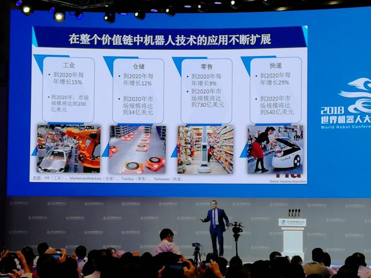 我們來(lái)看整個(gè)機(jī)器人產(chǎn)業(yè)的價(jià)值鏈,每個(gè)行業(yè)都在擴(kuò)展。工業(yè)領(lǐng)域每年增長(zhǎng)15%,也是最大的機(jī)器人市場(chǎng),倉(cāng)儲(chǔ)和物流行業(yè)也是如此,處于快速增長(zhǎng)的狀態(tài)。零售領(lǐng)域也在逐漸趕上,機(jī)器人既可以應(yīng)用在店面,也可以應(yīng)用在餐館,越來(lái)越多的人和機(jī)器之間產(chǎn)生互動(dòng),食品快遞方面可以有些機(jī)器人在街上把產(chǎn)品送到家里。