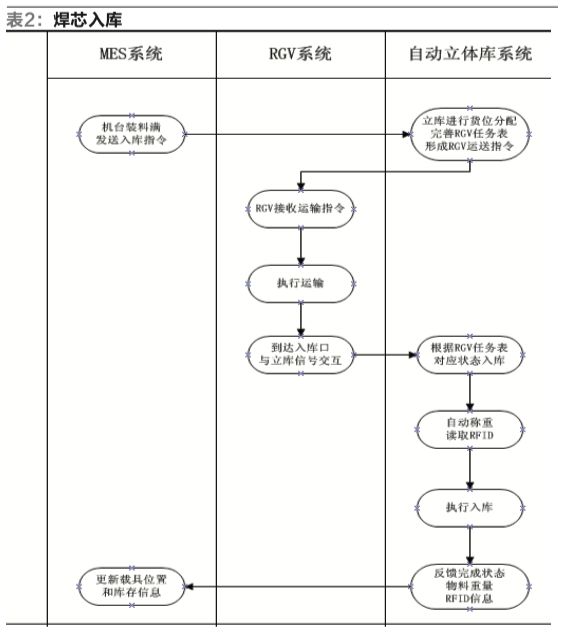 焊芯入庫:MES系統(tǒng)將入庫信息發(fā)送給立體庫,立體庫接收到入庫信息后完善RGV系統(tǒng)取貨站點及放貨站點任務(wù),RGV自動獲取運輸任務(wù),并啟動運輸,RGV取貨運行到立體庫入口位置反饋到位信息給立庫,立體庫處于接收狀態(tài)后RGV進行放貨,放貨完成后,立體庫稱重并入庫,更新庫存信息與MES庫存保持一致(物料位置、信息、貨位一致),如表2。