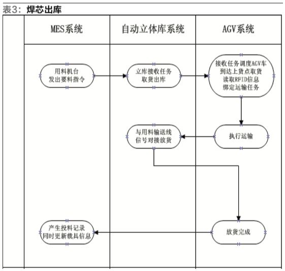 焊芯出庫:MES發(fā)出要料出庫指令(包括用料機臺地址、料斗號、RFID),由MES、立庫協(xié)同生成AGV的運輸指令,立庫系統(tǒng)確定出庫口位置,AGV自動獲取運輸任務(wù),取貨、讀取料斗RFID信息,綁定任務(wù)指令運送物料到用料機臺,如表3。