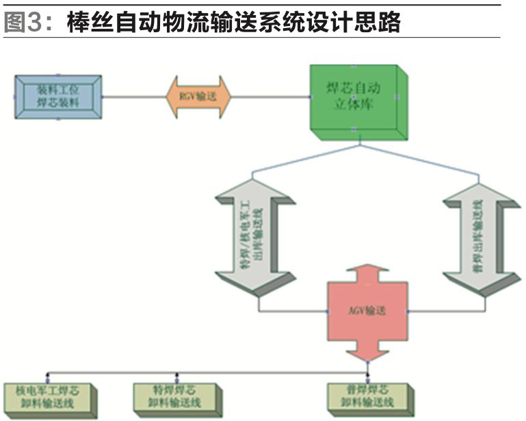 焊芯自動物流系統(tǒng)主要完成焊芯從裝料、暫存到使用的全線自動轉(zhuǎn)運流程(見圖1、圖2、圖3),