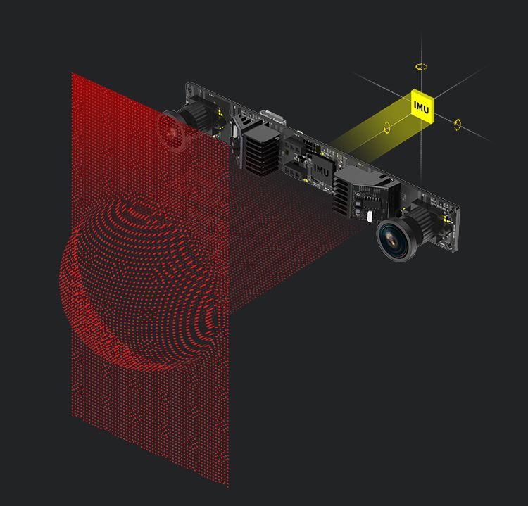 視覺+結(jié)構(gòu)光+慣性導航融合的雙目相機方案:室內(nèi)外通用的3D傳感器,適用室外強光環(huán)境,識別距離可達15m+,同時適用完全黑暗的室內(nèi)環(huán)境,完美解決室內(nèi)白墻和無紋理物體的識別難題。慣性導航可為VSLAM的應用提供精動的云端互補數(shù)據(jù),相較其他單一方案擁有更高精度和魯棒性。