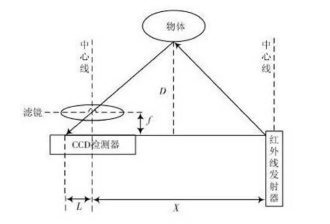 紅外傳感器包含紅外發(fā)射器與CCD檢測器,紅外線發(fā)射器會向障礙物發(fā)射紅外線,CCD檢測器則負責接收被障礙物反射回來的射線,由于物體的距離D不同,反射角度也會不同,不同的反射角度會產(chǎn)生不同的偏移值L,將這些數(shù)據(jù)收集后進行計算,就能得出障礙物的位置,從而實現(xiàn)避障。