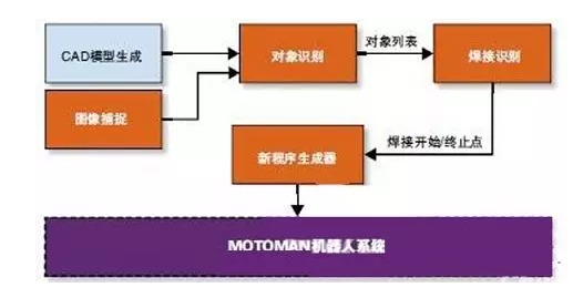圖3所示為一個虛擬系統(tǒng)流程圖,顯示了系統(tǒng)如何從圖像傳感器收集數(shù)據(jù)。視覺數(shù)據(jù)和CAD模型數(shù)據(jù)被搭配使用,用來確定對象列表,對象列表隨后被發(fā)送給焊接識別模塊,然后采用人工智能技術(shù)明確焊接要求。