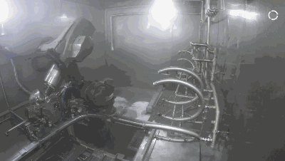 最后一步,機器人將工件放置在出料運輸單元上。在將工件送出清洗單元前,還會對工件外部進行沖洗。