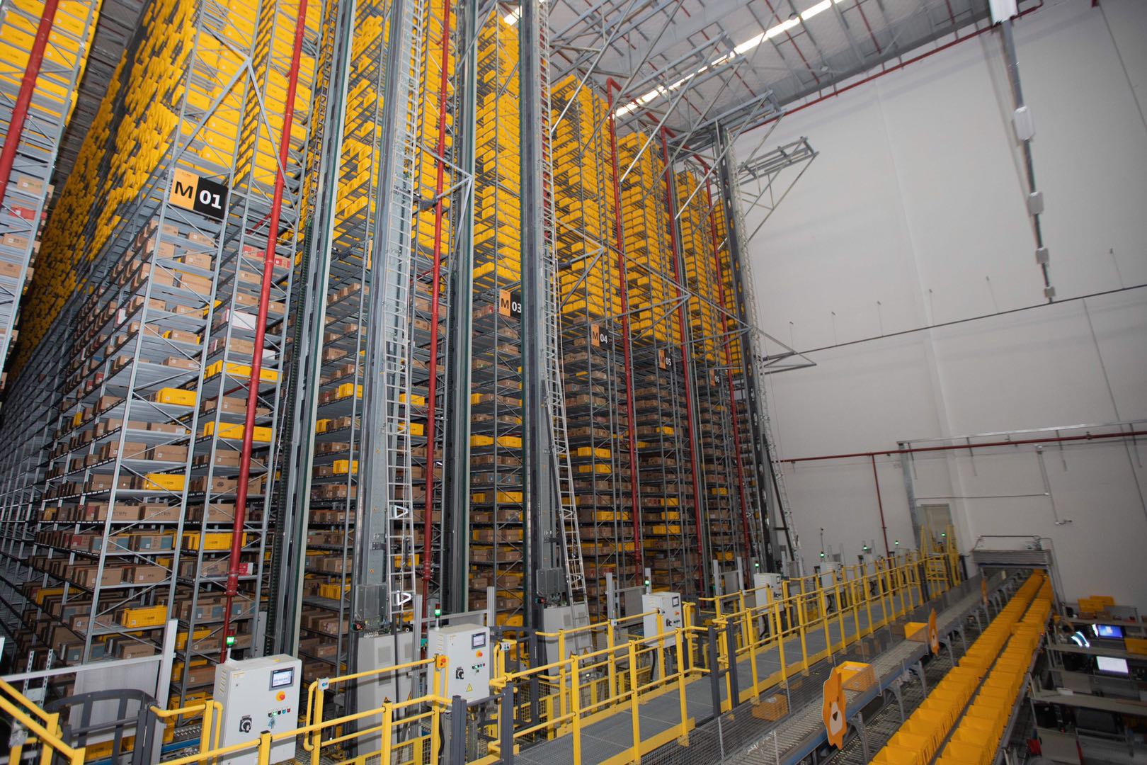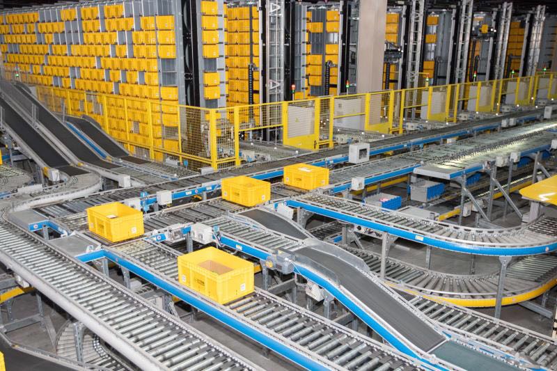 全程參與、打造了蘇寧云倉(cāng)的蘇寧物流研究院院長(zhǎng)欒學(xué)峰告訴記者,云倉(cāng)里的高速分揀輸送線總里程達(dá)到27公里。除了SCS的智能揀選系統(tǒng),從進(jìn)貨、存儲(chǔ)、到分揀、配訂單、包裝、發(fā)貨等,蘇寧云倉(cāng)全鏈條實(shí)現(xiàn)了智能化。存儲(chǔ)貨物的高密度存儲(chǔ)箱式自動(dòng)存取系統(tǒng)更有好萊塢大片里的科幻感。只見(jiàn)黃色銀色錯(cuò)落排序的20多米“云梯”,根據(jù)系統(tǒng)發(fā)送的指令,像機(jī)器人一樣,反復(fù)入庫(kù)、倒庫(kù),將黃色料箱及接近料箱標(biāo)準(zhǔn)的廠商原有包裝盒,有序放入超過(guò)20米高的密密麻麻“儲(chǔ)物間”。