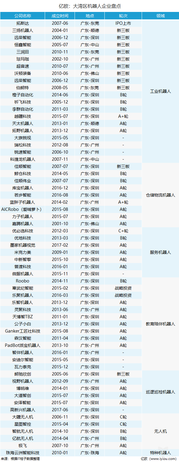為了更加深入的了解粵港澳大灣區(qū)的機(jī)器人產(chǎn)業(yè)發(fā)展,億歐搜集和整理了61家在落戶粵港澳大灣區(qū)的A輪以上機(jī)器人企業(yè),希望從中梳理出大灣區(qū)機(jī)器人產(chǎn)業(yè)的未來發(fā)展方向。