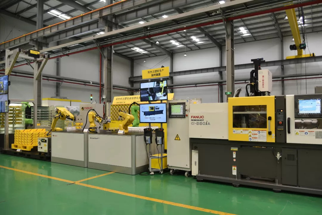 生產(chǎn)執(zhí)行系統(tǒng)(MES)是智能工廠規(guī)劃落地的著力點。該系統(tǒng)以雙色杯作為展示產(chǎn)品,通過上海發(fā)那科的生產(chǎn)執(zhí)行系統(tǒng),對產(chǎn)品的整個生產(chǎn)流程進行信息化管理。從微信遠程下單、注塑機注塑生產(chǎn)、機器人裝配以及包裝到最終成品儲存管理,通過AGV與協(xié)作機器人配合對產(chǎn)品進行各工位轉(zhuǎn)移,展示無人化智慧工廠的模型。