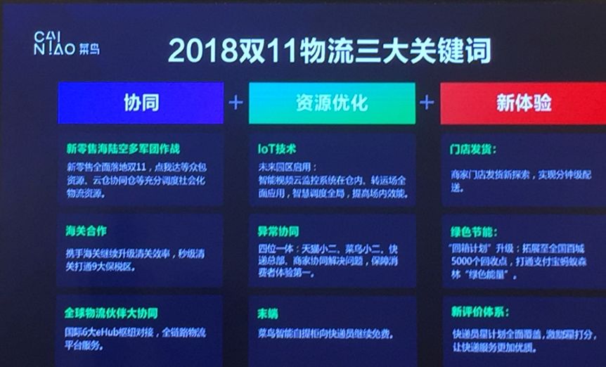 正因?yàn)榇耍趧?dòng)員會(huì)上,菜鳥云快倉事業(yè)部總經(jīng)理、雙11項(xiàng)目副總指揮孫建提出了“全球一張網(wǎng),智慧大協(xié)同”的備戰(zhàn)策略。他表示,新零售大潮下,新物流時(shí)代已經(jīng)走來,包裹量快速增長的同時(shí),數(shù)字化和精細(xì)化成為行業(yè)關(guān)鍵詞,第十個(gè)雙11,將是在智能物流骨干網(wǎng)協(xié)同下,全行業(yè)資源優(yōu)化的一次大考,和依托IoT技術(shù)的一場新物流大練兵。