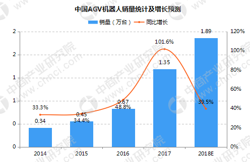 隨著工業(yè)機(jī)器人應(yīng)用場景的不斷拓展,在國內(nèi)工業(yè)機(jī)器人需求量激增以及“中國制造2025”、智慧物流等一系列政策的推動(dòng)下,AGV機(jī)器人銷售量將持續(xù)增長。據(jù)數(shù)據(jù)顯示,2017年中國AGV銷量達(dá)到1.35萬臺(tái),與2016年的0.67萬臺(tái)同比增長101.6%,隨著AGV在其他領(lǐng)域的滲透,預(yù)計(jì)2018年中國AGV銷量將達(dá)到1.89萬臺(tái)。