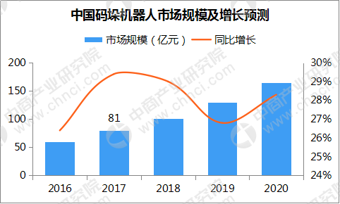 市場規(guī)模方面,2017年碼垛機(jī)器人市場規(guī)模約為81億元,同比增長29%。未來,受利好政策推動(dòng)、物流行業(yè)快速發(fā)展等因素影響,碼垛機(jī)器人市場規(guī)模將進(jìn)一步擴(kuò)大,預(yù)計(jì)到2020年有望超165億元。