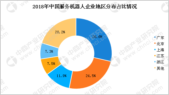 在中國服務(wù)機器人企業(yè)地區(qū)分布方面,廣東占比最高,全國占比達(dá)到28.6%;排名第二的是北京,占比為24.5%;排名第三的是上海,服務(wù)機器人企業(yè)占全國服務(wù)機器人企業(yè)的11.9%;其后分別為江蘇和浙江,占比分別為7.5%以及7.3%。
