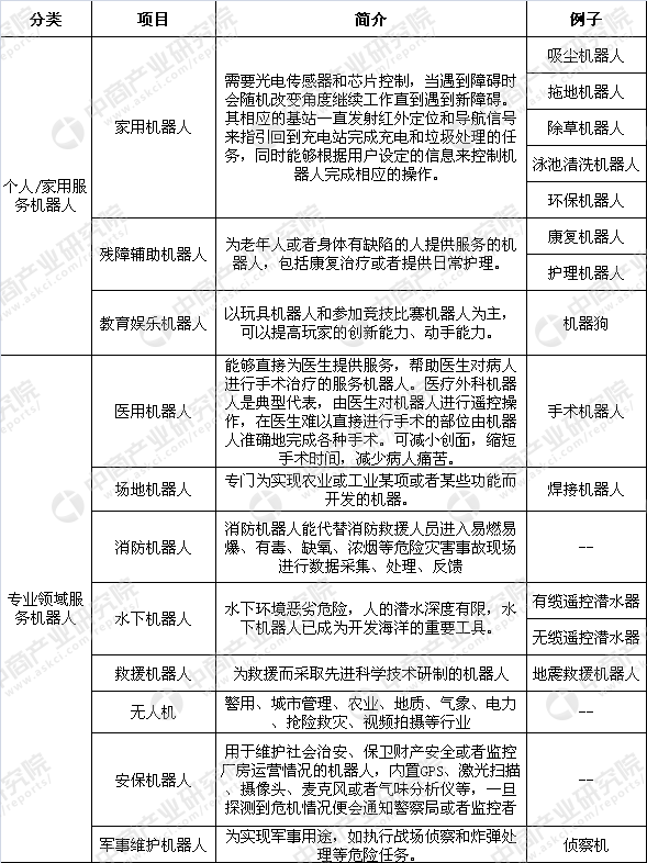 參照國際機器人聯(lián)盟(IFR)按照應(yīng)用領(lǐng)域劃分的分類,將服務(wù)機器人分為個人/家用機器人(Personal/Domestic Robots)和專業(yè)服務(wù)機器人(Professional Service Robots)兩大類。服務(wù)機器人的應(yīng)用范圍很廣,主要從事維護保養(yǎng)、修理、運輸、清洗、保安、救援、監(jiān)護等工作。其中,個人/家用機器人主要包括:家庭作業(yè)機器人、娛樂休閑機器人、殘障輔助機器人、住宅安全和監(jiān)視機器人等;專業(yè)服務(wù)機器人主要包括:場地機器人(Fieldrobotics)、專業(yè)清潔機器人、醫(yī)用機器人、物流用途機器人、檢查和維護保養(yǎng)機器人、建筑機器人、水下機器人,以及國防、營救和安全應(yīng)用機器人等等。
