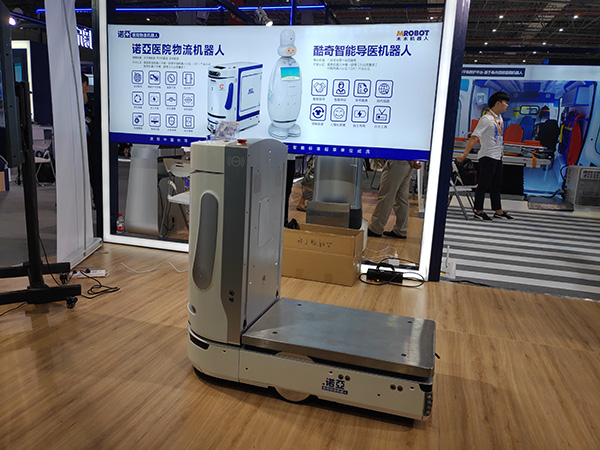 木木機(jī)器人是一家創(chuàng)辦僅4年的公司,它現(xiàn)場(chǎng)展現(xiàn)了一款醫(yī)院物流機(jī)器人,小推車(chē)外型的它,可以自動(dòng)尋路,上下扶梯,運(yùn)輸藥品、被服、餐食、器材等,最大載重量有300公斤。