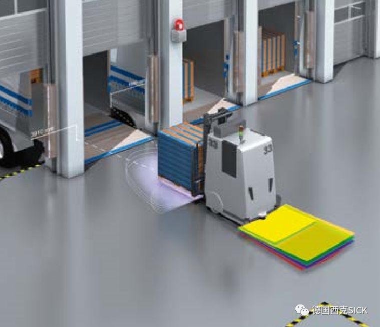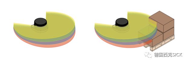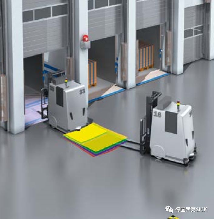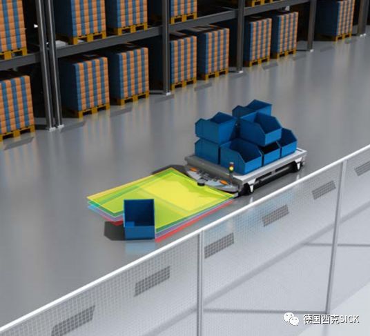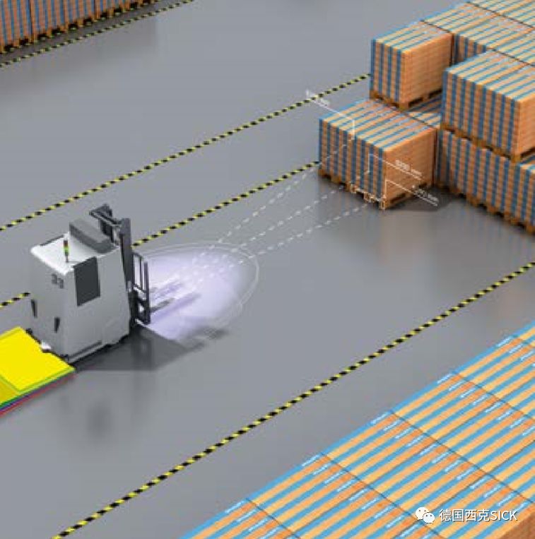 使用MRS1000測量多達(dá)四個(gè)平面的數(shù)據(jù)輸出,AGV機(jī)器人能根據(jù)空間中的自然地標(biāo)實(shí)現(xiàn)可靠導(dǎo)航。比如,通過檢測和監(jiān)控駕駛路徑,MRS1000可簡化小車的駛?cè)肓鞒?,且確保不發(fā)生碰撞。此外,通過四個(gè)平面的數(shù)據(jù),能可靠檢測AGV機(jī)器人運(yùn)行前方地面上或空中伸入路徑的障礙物,實(shí)現(xiàn)3D防撞避障。