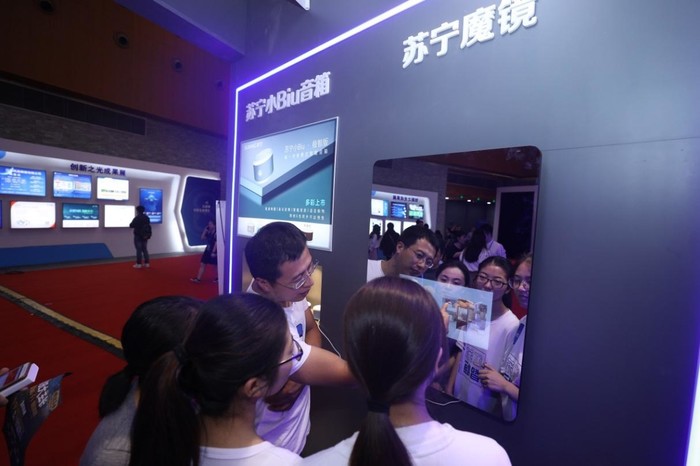 (蘇寧展區(qū)工作人員正在介紹黑科技產(chǎn)品 “魔鏡”)