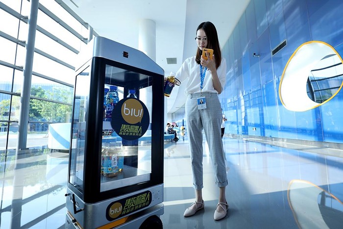 以后逛街口渴了,再也不用滿商場找飲料店了,蘇寧售貨機器人將在商場內(nèi)全天候巡游。