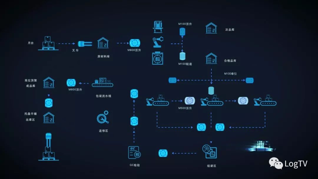 Geek+研發(fā)生產(chǎn)的搬運機器人主要以M型號機器人為主打,在此次針對制造工廠的搬運解決方案里,M100機器人可以有三種用法,即M100機器人分別配備不同的載具在不同的場景內(nèi)作業(yè)。